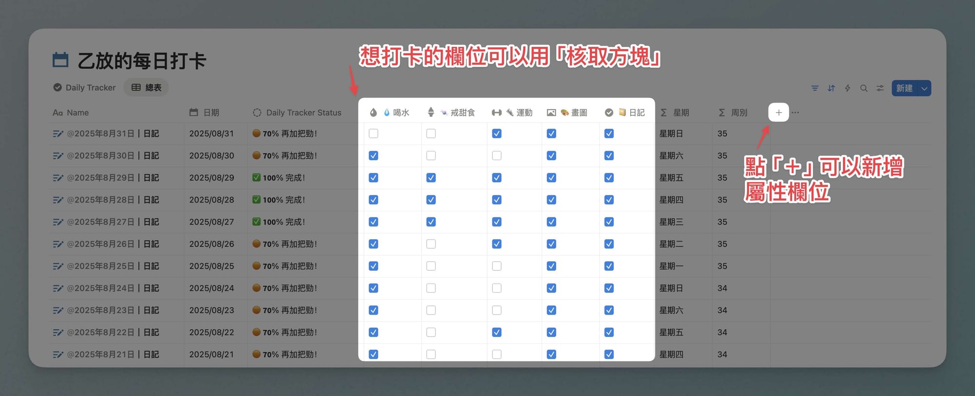 乙放的每日習慣打卡系統步驟1️⃣:建立資料庫的屬性欄位