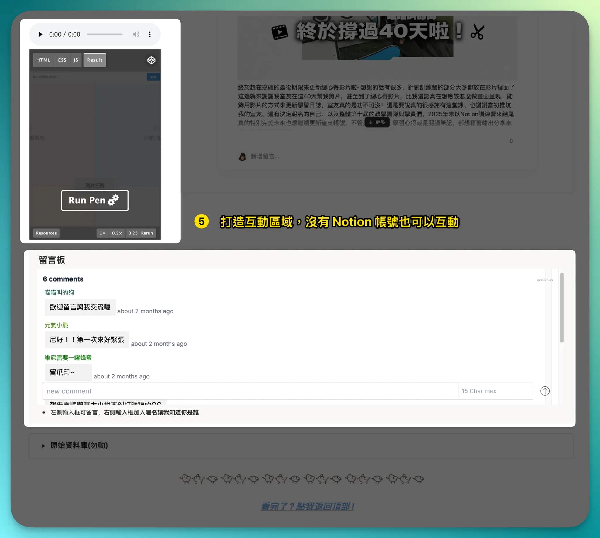 - 互動區塊:透過小插件創造互動,不是只有一閱而過而已,而是希望可以讓人留下足跡,並且運用留言板插件,就算沒有 Notion 帳號,也可以輕鬆做到互動喔!💃