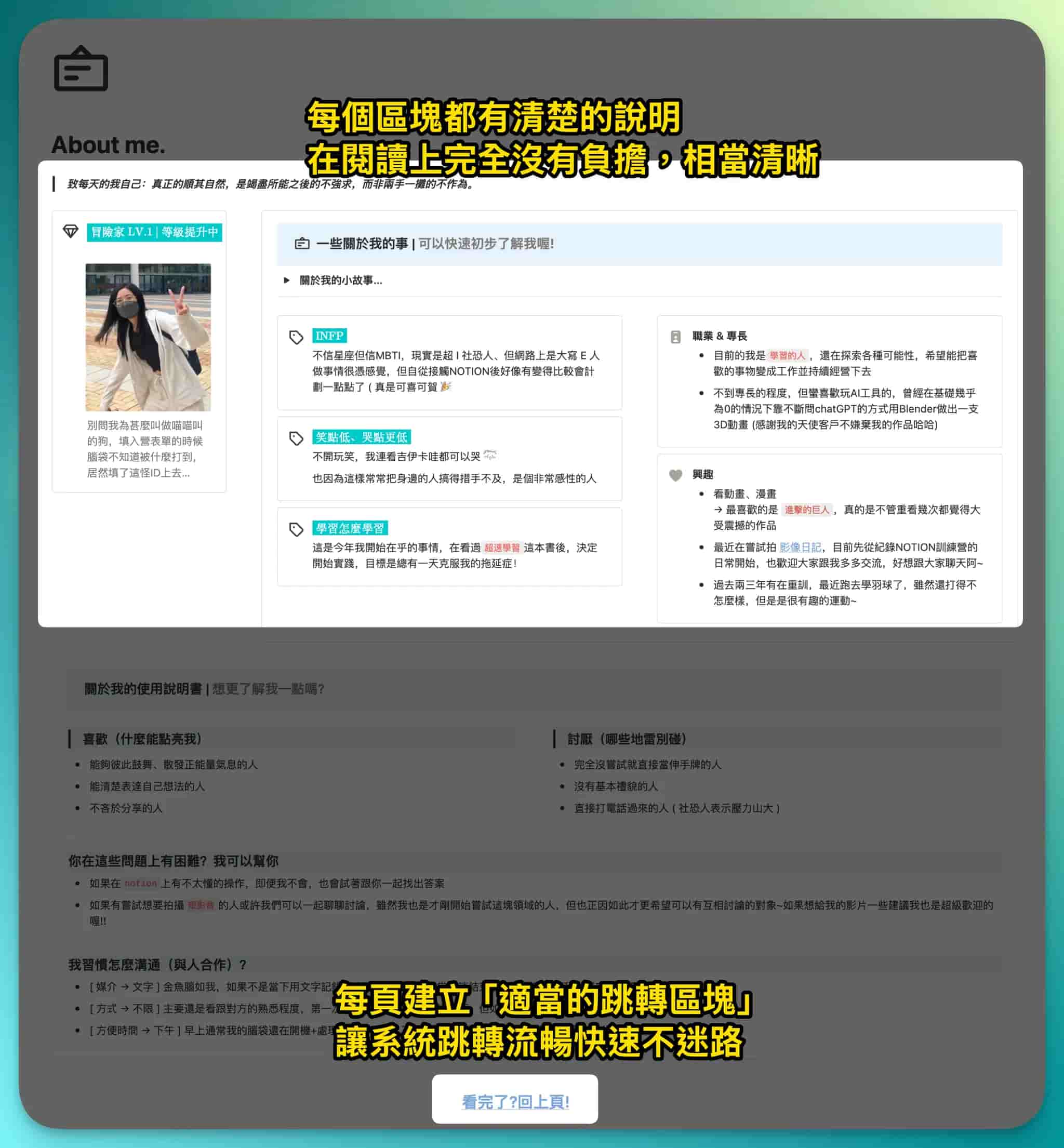 - 希望大家可以依照過往對網站的使用習慣一眼就知道該怎麼閱覽這個網站,透過這種簡單感,成為推坑非 Notion 使用者開始對 Notion 感到好奇的契機。