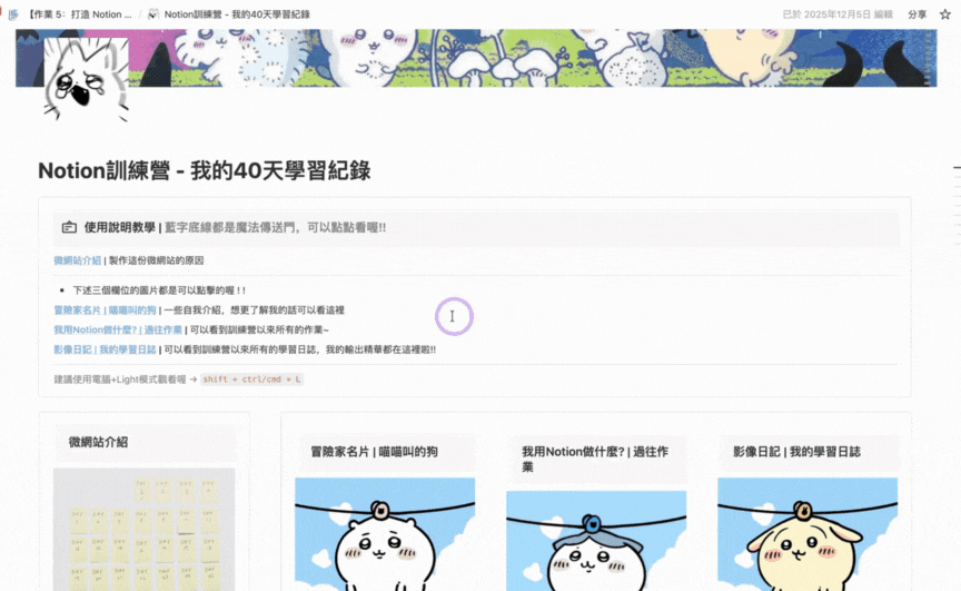 所以今天,Summer 就想要帶大家一起來看看,喵喵狗在營期之中「Notion 訓練營 - 我的 40 天學習紀錄」的微網站建構,一起來看看他的作品以及可以讓大家學習的知識點吧!GOGO✧ ─=≡Σ((( つ•̀ω•́)つ