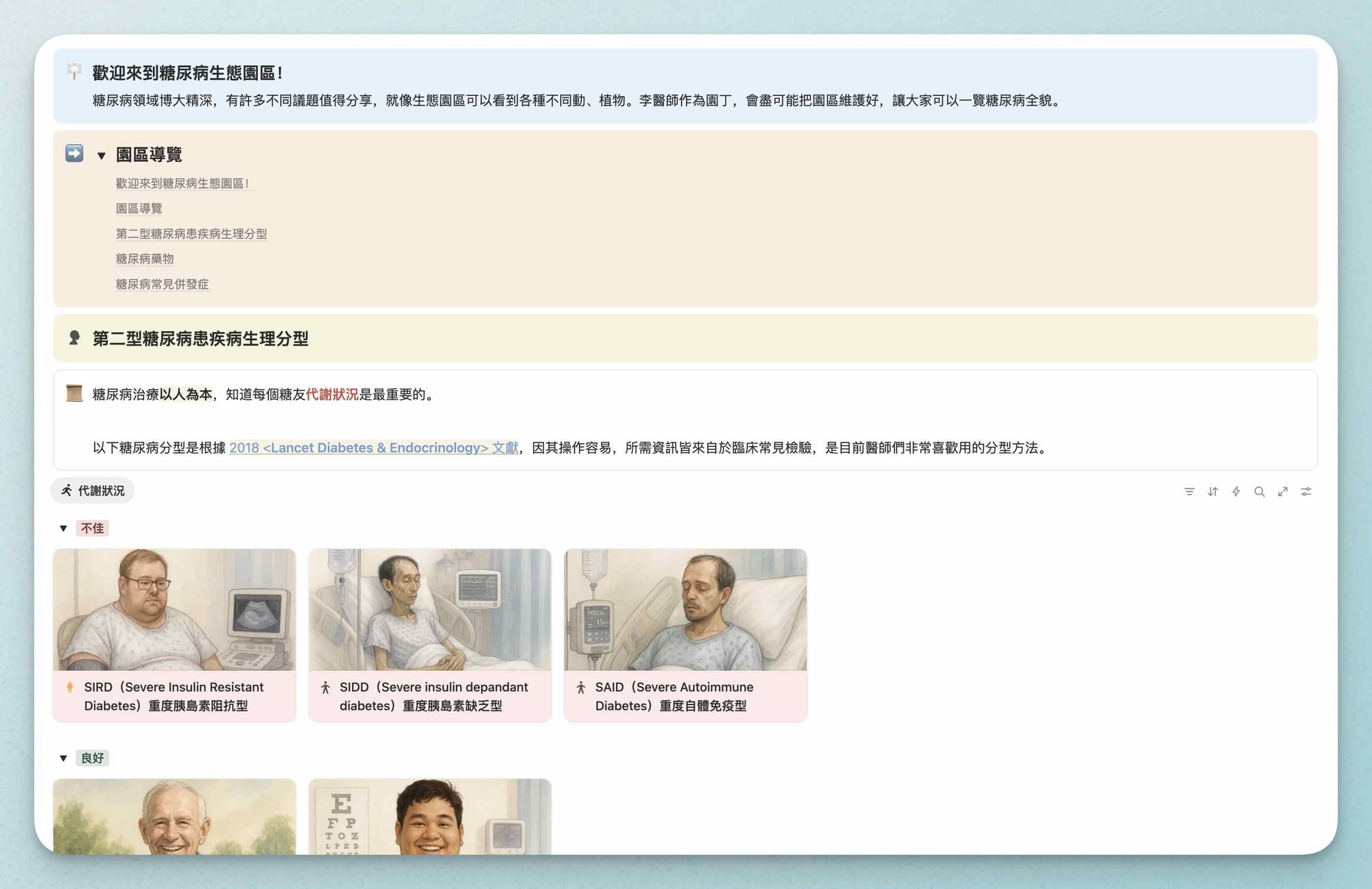 今天想和大家分享的是 neurolee 在訓練營的第二週作業!在頁面介紹中 neurolee 提到:「就像生態園區可以看到各種不同動、植物。李醫師作為園丁,會盡可能把園區維護好,讓大家可以一覽糖尿病全貌。」