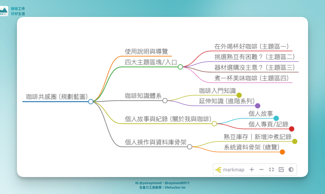 我運用在營期中的Notion所學、基於我本身的咖啡涉獵知識,搭配AI的協作,於訓練營中第五週的作業,建立這個一站式咖啡風味 × 跑店 × 器材 × 沖煮微網站。以下為我的網站規劃心智圖。