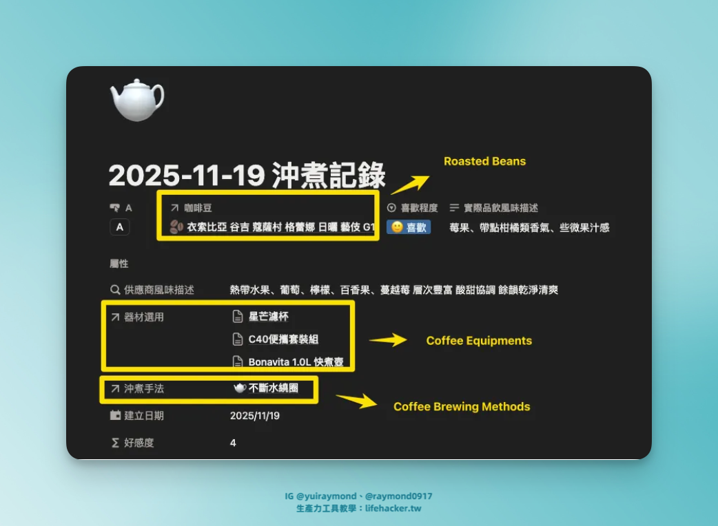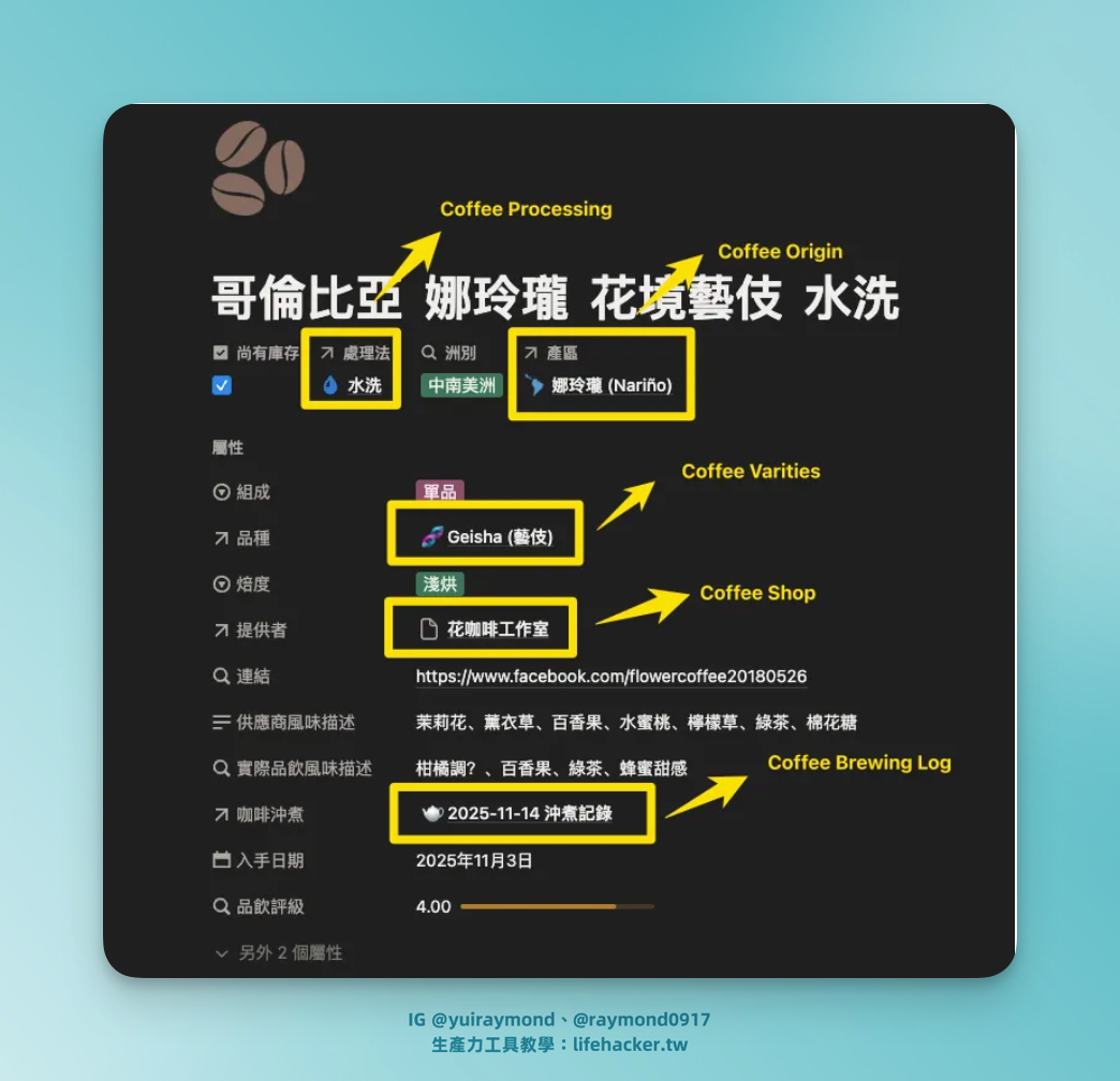 參與訓練營後,我學會了拆解資料庫,並運用標籤資料庫與資料庫關聯,讓咖啡相關的所有元素都能相互連結。實際解析如下: