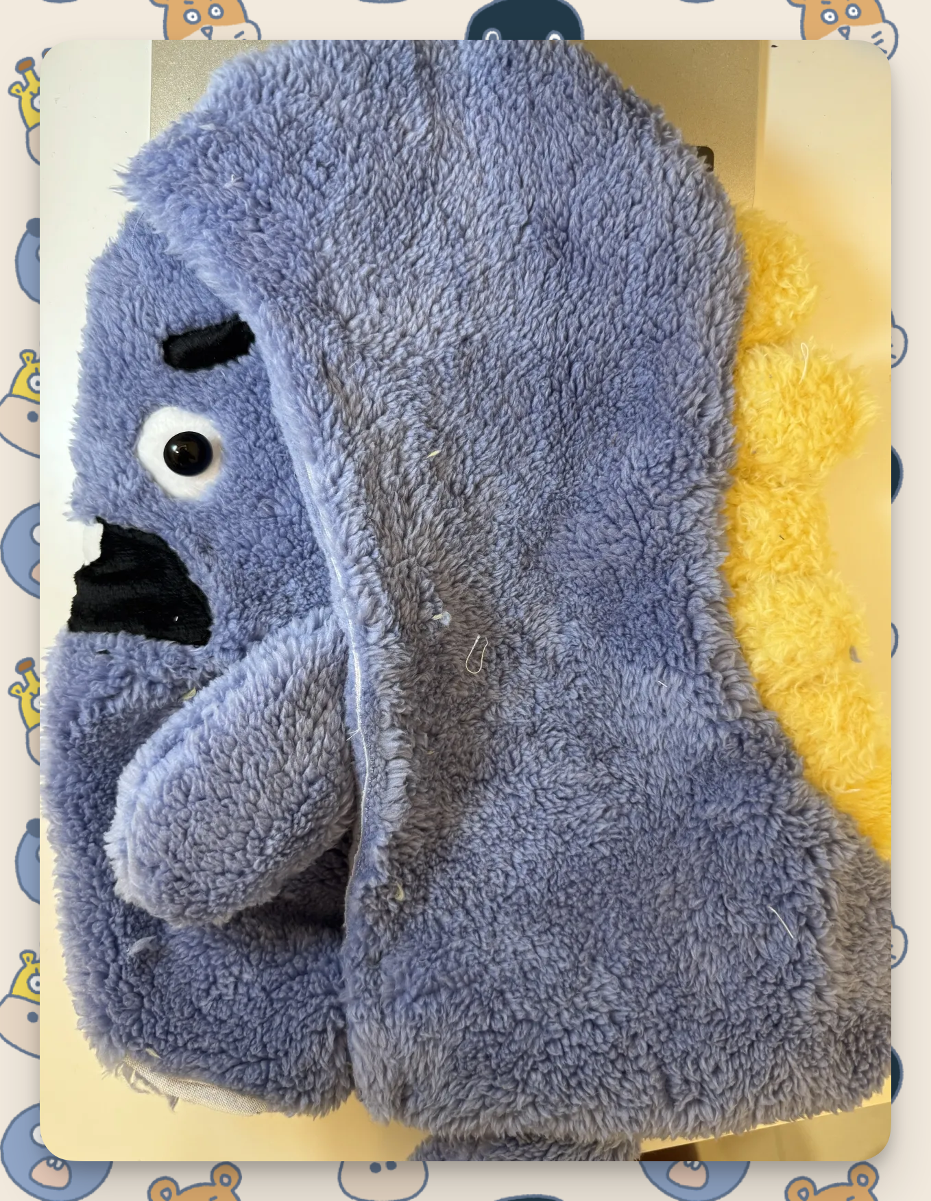 最近的鼠鼠因為拿到公司不要的一塊舒服毛毛布,開始做男友的創造角色「 DD 龍」的包包,做的過程中花了不少時間在想 DD 龍的結構,也重拆了很多次。