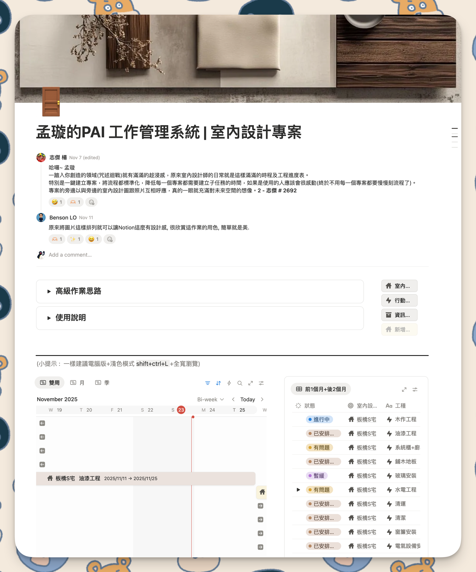 其中孟璇的作業讓我印象很深刻,除了她的作業都非常簡潔, 精美,也可能是因爲現在的工作型態也是類似室內設計師的型態,所以特別有共鳴。這週就來拆解孟璇的第三週作業來看他是怎麼讓 Notion 幫助自己的室內設計專案工作 ✨