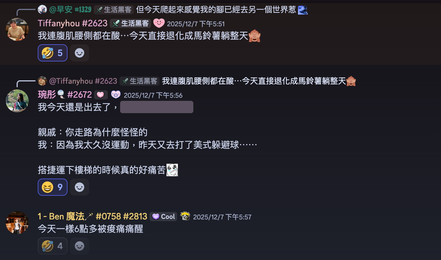 當我們拋開現實中的工作、學習、生產力後,運動不只能讓大家舒展筋骨,也是個能夠讓一群原本只在網路上交流的人們快速凝聚的主題,透過合作與策略為自己的隊伍贏得勝利,也真心為其他表現好的隊伍喝采加油。