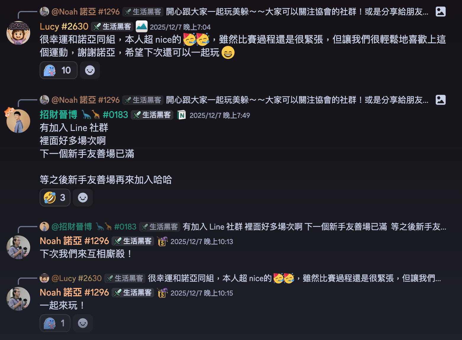這場運動會總共有三十多位來自全台各地的島民參加,有些是島上的熟面孔,而有些是上個月剛結束第十屆 Notion 訓練營期的學員們,還有一些是在島上默默潛水多時,第一次參加活動的會員。