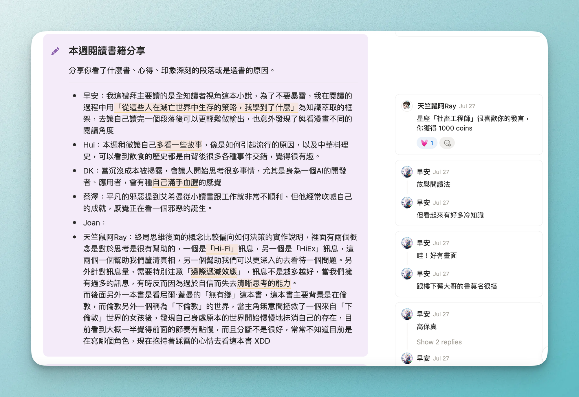 - 蔡澤大哥小聚時會開麥分享很多我沒接觸過的閱讀領域,還很擅長帶動氣氛和聊天節奏,最後幾場總是聊到不想下線 ,還能一起暢想全知讀者的結局 XDD