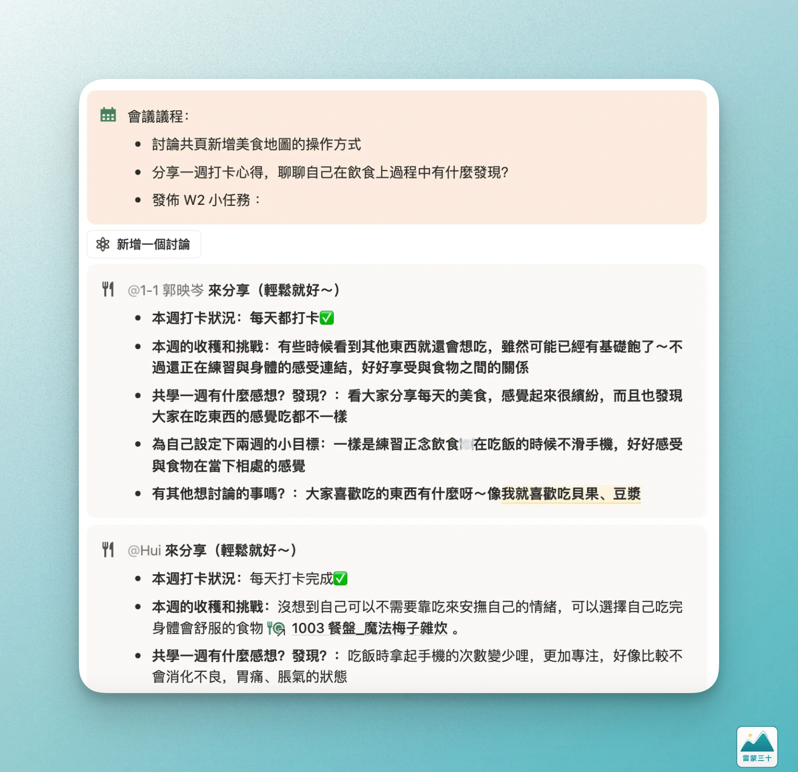 - 飲食打卡沒有什麼問題,但問題總是希望在過程中大家能夠更加投入的討論,線上小聚的時候不見得大家會互相討論。但飲食的打卡、對自己飲食&情緒的覺察其實都是有,只是不見得會在小聚上熱情地聊,大部分都是我在幫大家接話 XD