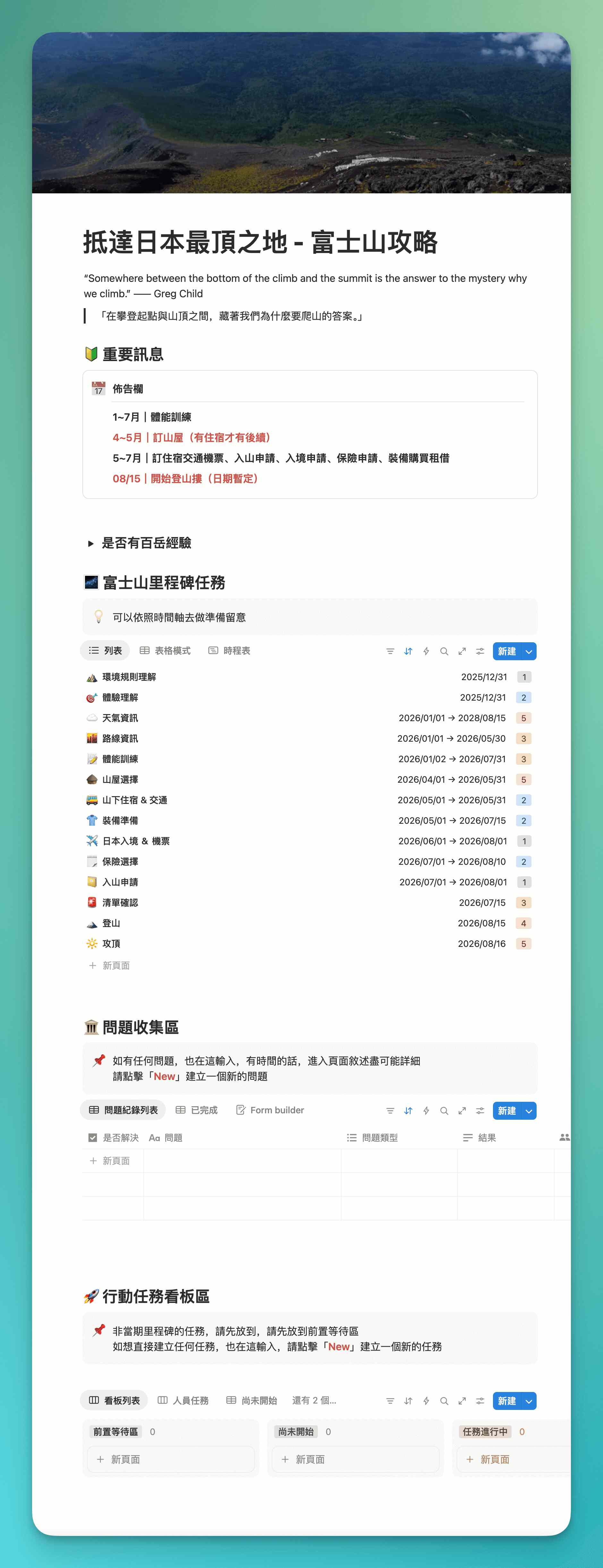 當然,這份模版最吸引人的,還是每個「里程碑任務」都有滿滿的豐富資訊,是一份「有在使用」的系統!