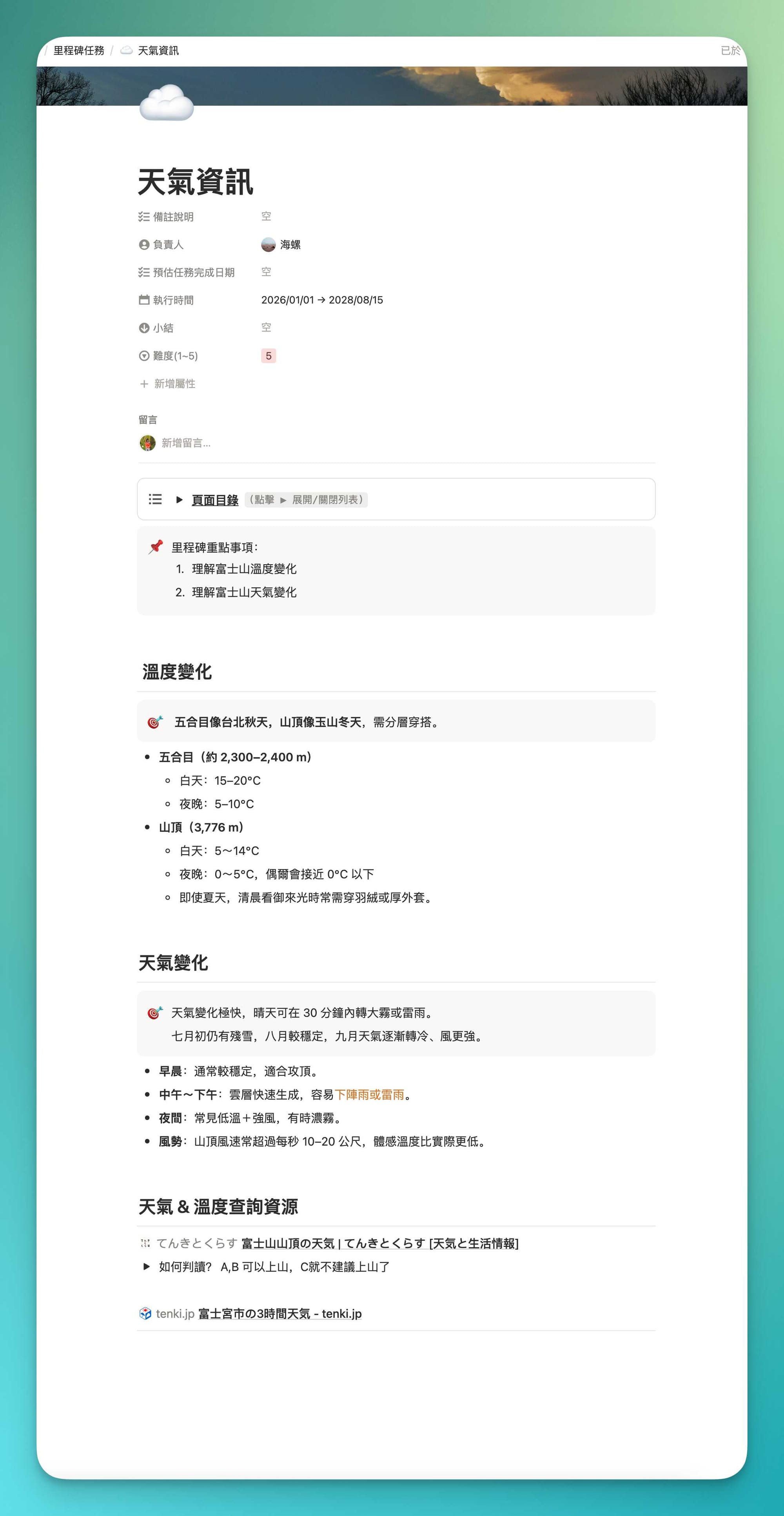 點進「富士山里程碑任務」後,如:「天氣資訊」,可以看到用折疊列表收納起來的「頁面目錄」,方便讀者需要時再打開,並透過「標註區塊」讓整體版面相當美觀!