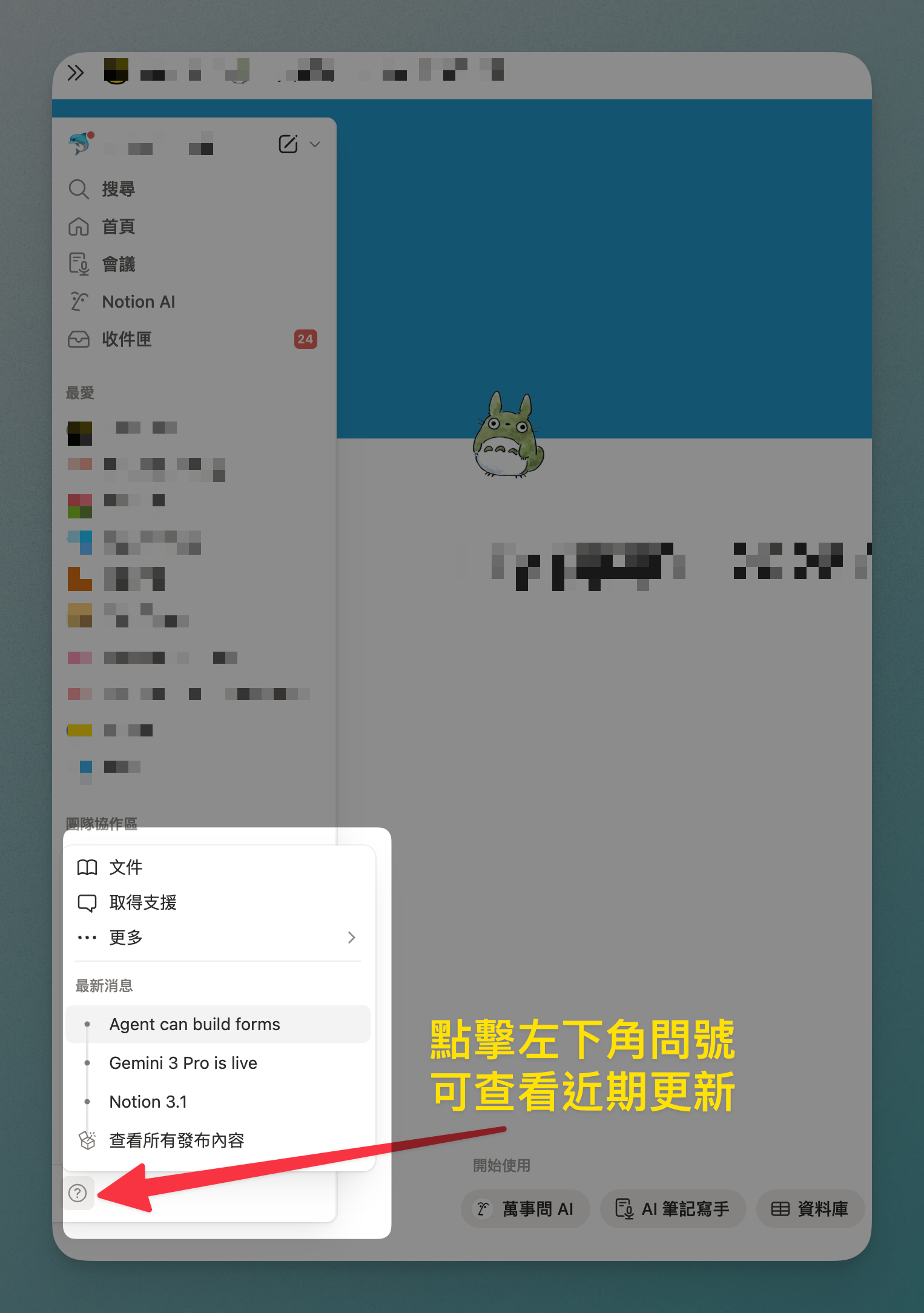 點擊工作區左下角「問號?」,可查看近期更新- 現在可以從工作區左下角的「?」,來查看 Notion 更新的變更日誌了!它會呈現更新時間軸,並連結到更新日誌,可以隨時追蹤更新動態。