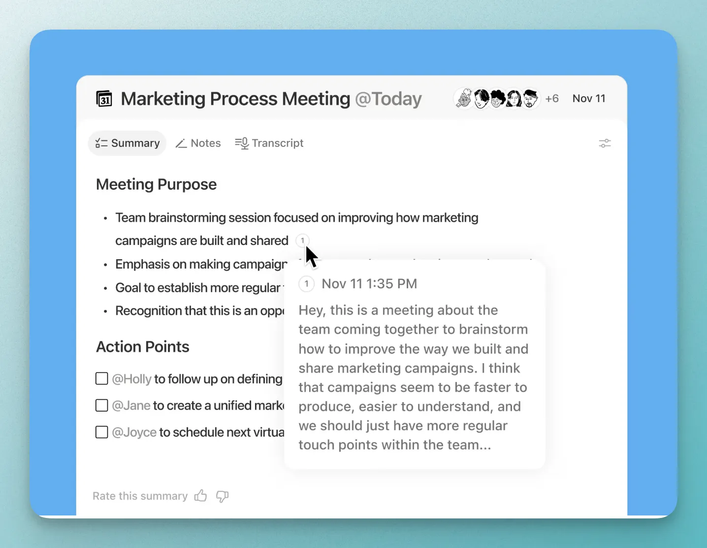 圖片來源:What’s New - Notion - 「AI 會議筆記摘要」現在會將每個列點,連結到逐字稿中的特定時刻,讓你可以直接跳到來源處。這對於理解決策的脈絡、對齊會議共識,或是在交接待辦事項、提供完整脈絡,都非常有幫助。