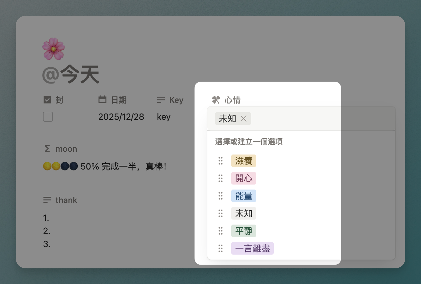 用「條件式顏色」輕鬆打造出心情彩色日記步驟1️⃣:在資料庫中新增「心情」欄位及選項