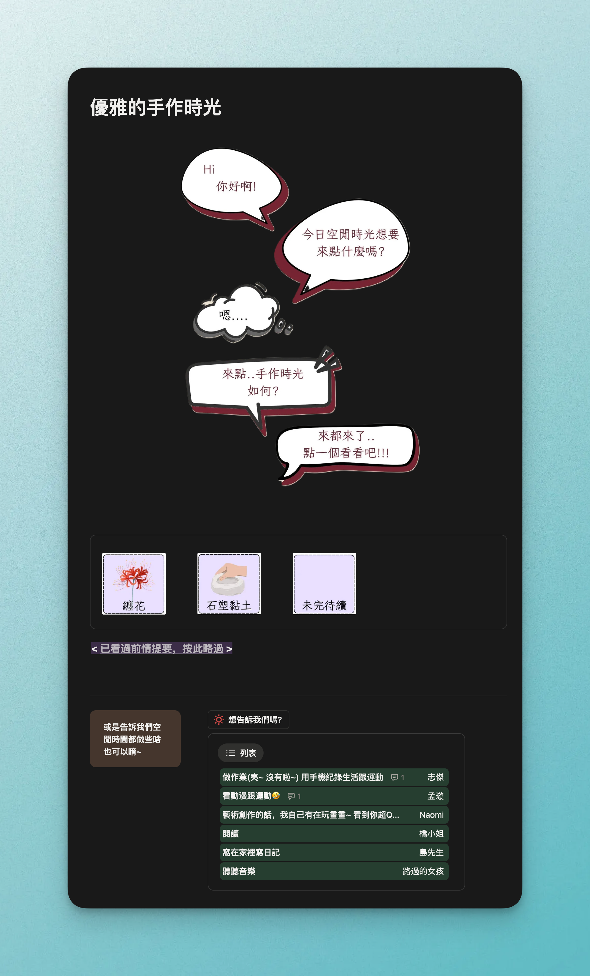 有了架構後,思考假如要展示如何讓網頁有趣的一點,而不是一下就一堆資訊,既然按鈕可以做提示詞詢問,放大版本直接用頁面呈現進行對話(設計好奇感),並且新增你說我做單元來點其他的互動,利用問卷方式新增推薦內容。就這樣完成了一個網站呈現