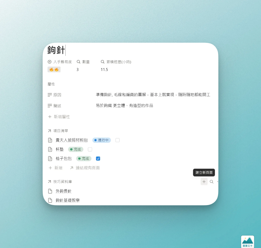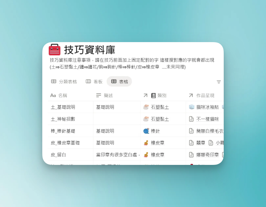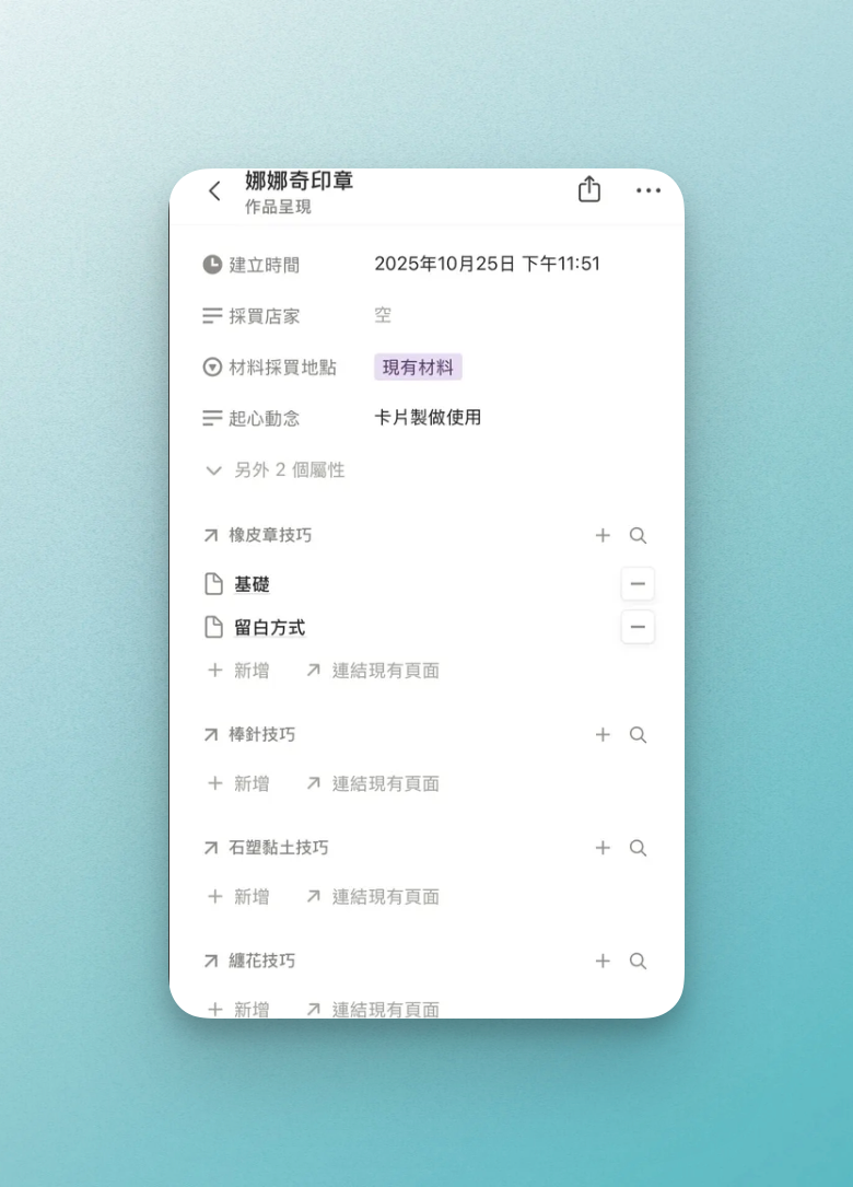 每次在製作都會有所學習,我也想要記錄下來,想似的作品每次都放一樣的技巧,感覺也不妥,所以建立了各項類別的各自技巧資料庫,這樣如果有作品使用到某技巧就直接互相關聯那個技巧頁面,這樣就不用重複,也能更整齊。