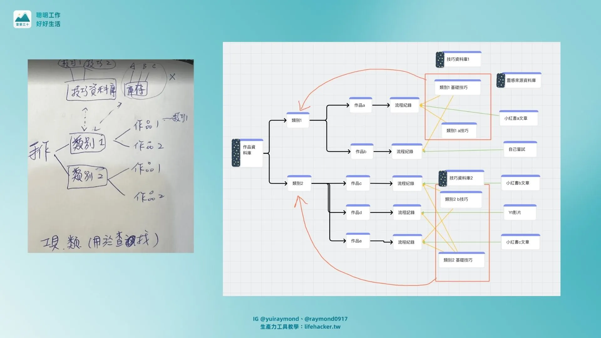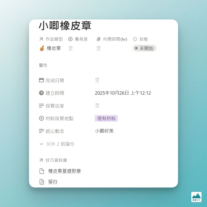 - 作品摘要:雅雯使用 Notion 將手作的資料做整合,運用關聯功能以及 PAI 的思維,將項目作為專案,作品為行動,最後相關靈感則為 Inbox,搭配最後微網站建立實現管理以及展示一起運行,更符合個人的需求。