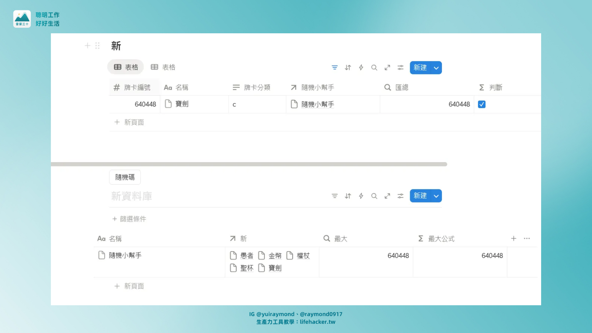 - 在這一步卡得比較久,資料庫的關聯測試花比較多時間,這裡會需要另外增加一個隨機資料庫,並且關聯至塔羅牌庫資料庫,利用公式隨機產生許多數字,再透過公式篩選出最大值,關聯回塔羅牌資料庫,並利用公式,核取確認數值等於最大值的牌卡,並透過篩選機制篩選出來那一張卡牌。