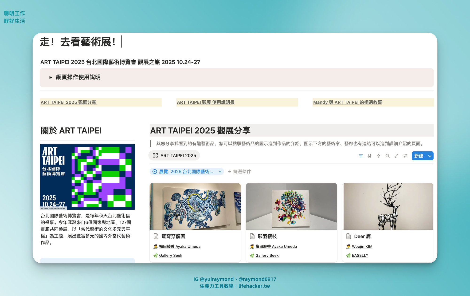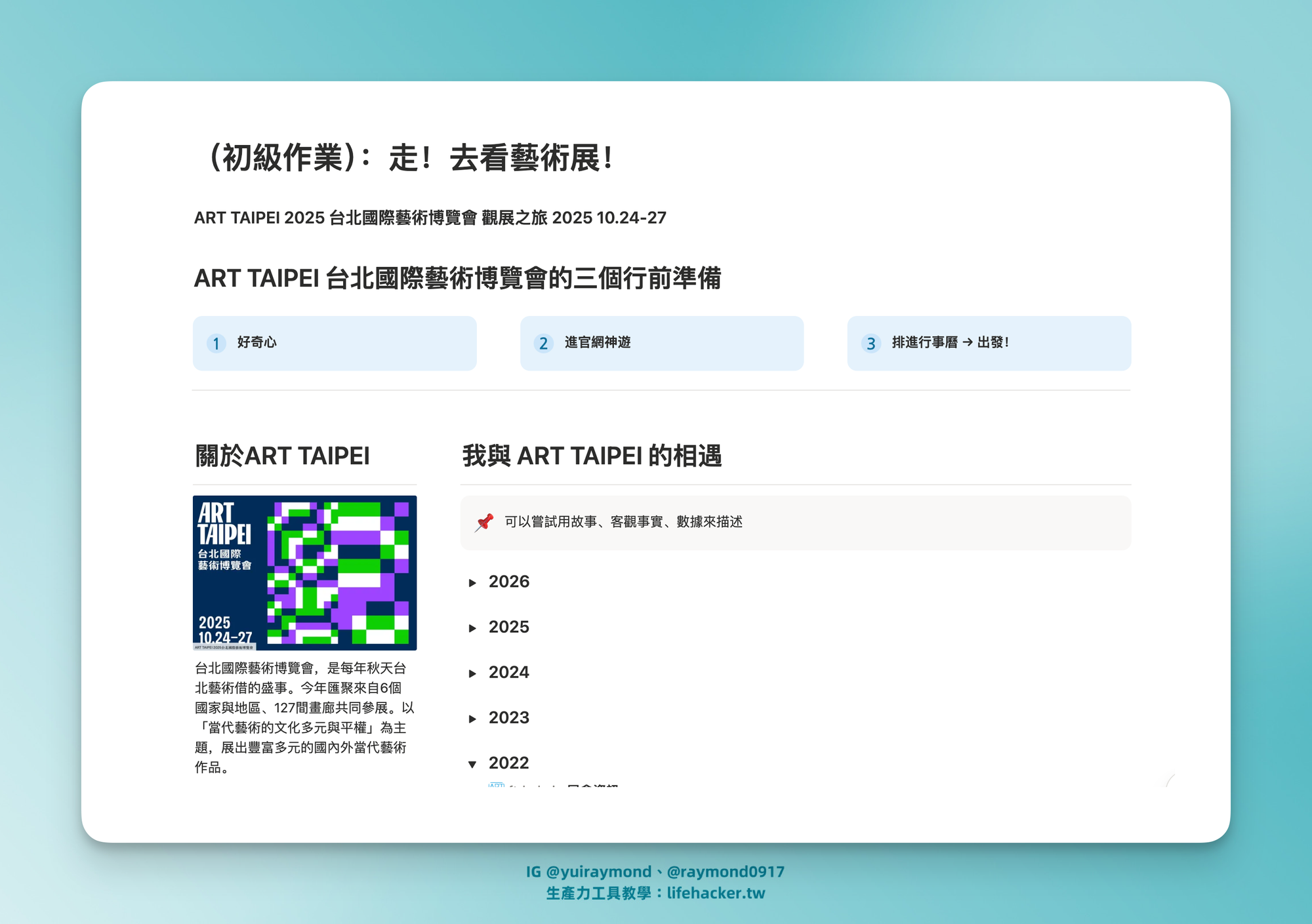 - Mandy 與 ART TAIPEI 的相遇故事:分享我自己的看展經歷,看展最重要的是「行動」,喜歡不喜歡,看了就知道。我運用Notion訓練營學到的PAI 系統復盤過往的看展經驗,希望明年看展前做一點準備,逐步累積看展的經驗和知識。