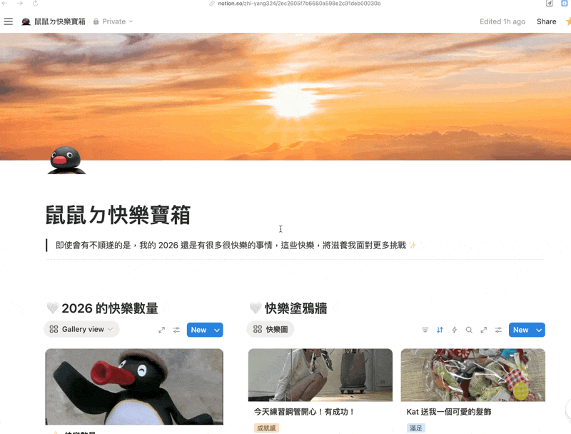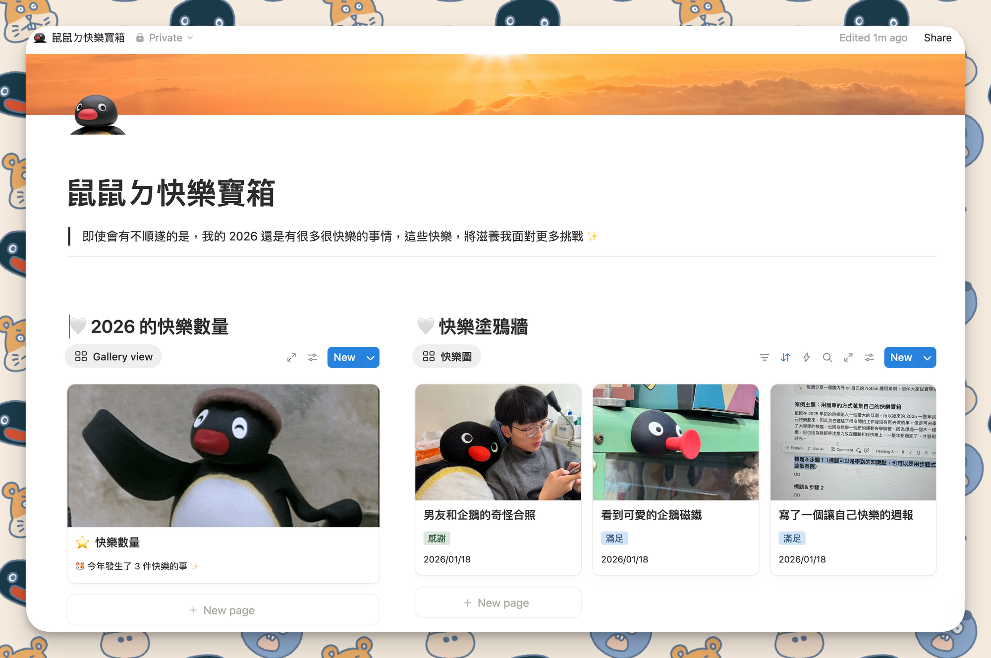 於是到了 2026 年初,鼠鼠決定用 Notion 為自己打造一個快樂寶箱,記下每一個讓我笑出來、感動落淚、心裡暖暖的小片段,讓這些瞬間能好好被留下、回顧與珍藏。