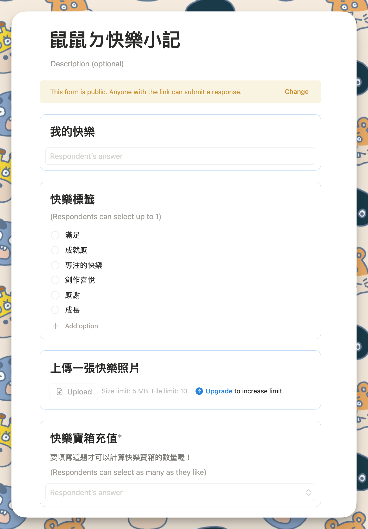 從上面的截圖裡,可以看到我是用兩個資料庫來建立起這個快樂寶箱,但其實其一個資料庫是由 Notion 表單所生成的,下圖是我的表單設定頁面