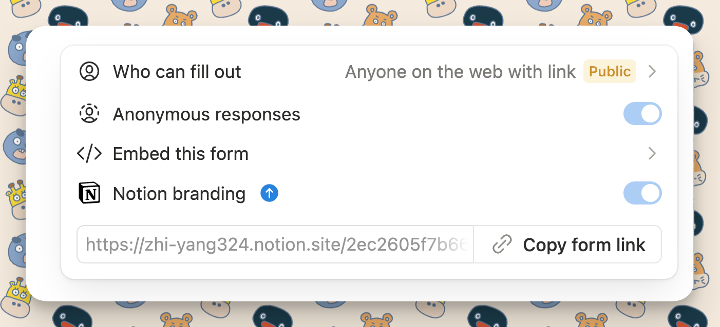 從上面的截圖裡,可以看到我是用兩個資料庫來建立起這個快樂寶箱,但其實其一個資料庫是由 Notion 表單所生成的,下圖是我的表單設定頁面