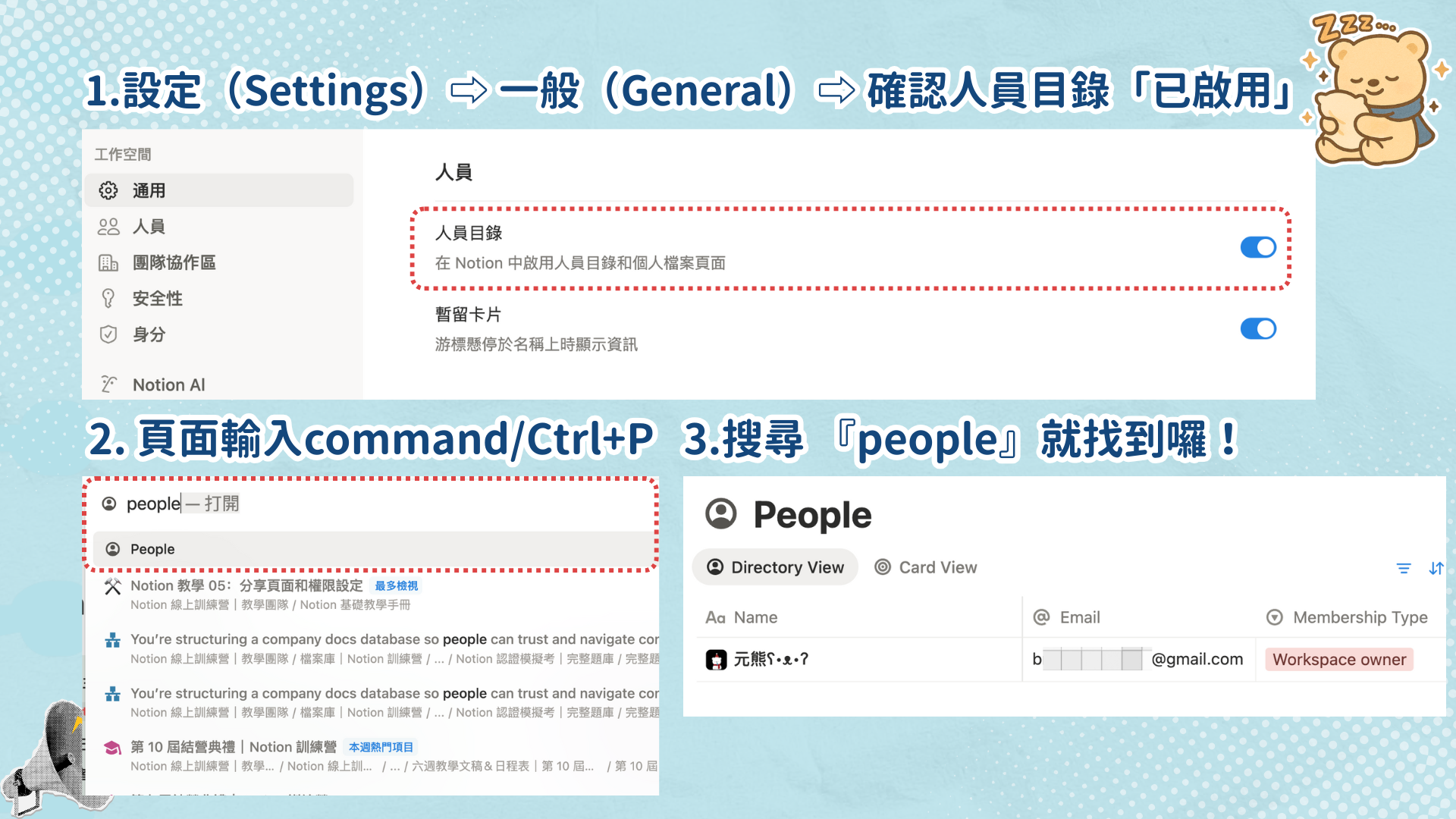 command/Ctrl + P,搜尋 『people』就能找到這個資料庫! - 此資料庫具備成員的帳號、工作區的權限,同樣可以新增屬性、設定篩選並可以連結到其他資料庫,推薦給還沒有建立員工目錄或是需要更新的團隊!