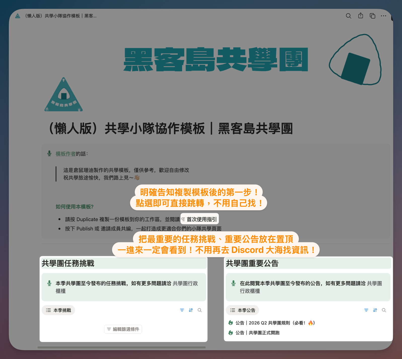 用 Linked view of database 的方式,將共學團的資料庫連結複製於此,大家在複製模板時,同步就了解這一季共學團的行事曆,不用再回到島上翻找,非常貼心!